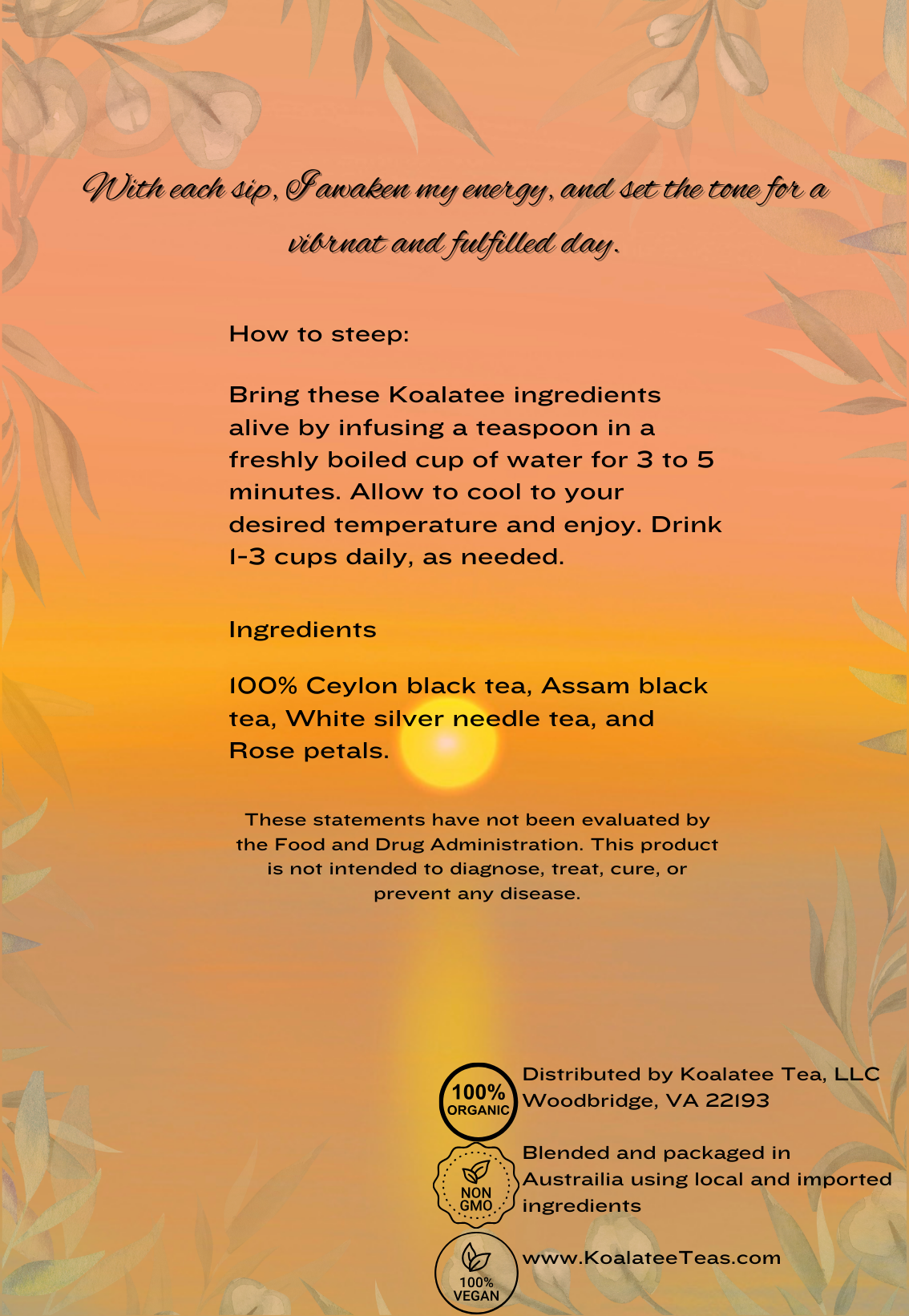 Kickstart your day with a burst of energy and elegance with our Morning ActiviTEA breakfast blend. A loose leaf blend crafted from the finest Assam and Ceylon black teas, infused with premium white tea, and delicately finished with a hint of rose, it's the perfect way to kickstart your morning routine. With a modest amount of caffeine, equivalent to 1/3 of a cup of coffee, Morning ActiviTEA provides a gentle yet invigorating boost to fuel your day. Packed with natural antioxidants, this blend is traditionally associated with slowing signs of aging and supporting metabolism, helping your body burn fat more readily. Embrace the dawn with Morning ActiviTEA and seize the day with vitality and vigor.